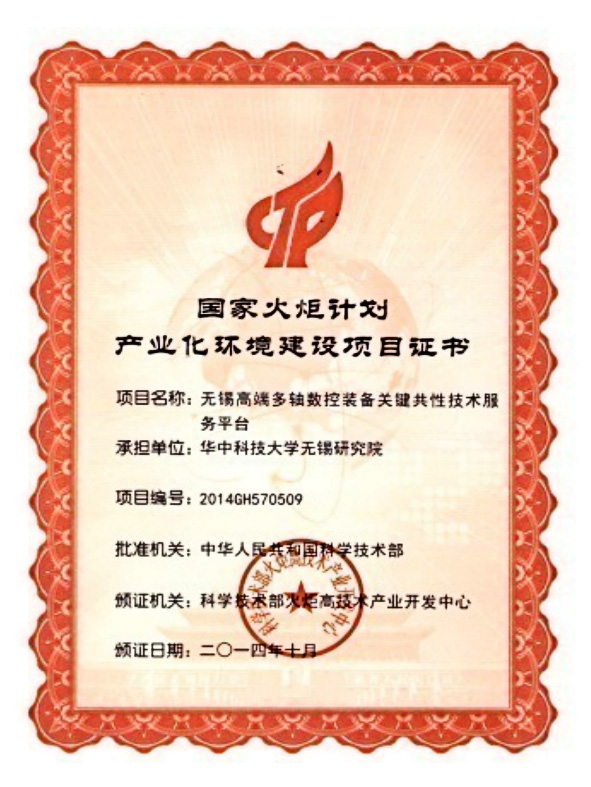 國家火炬計劃產(chǎn)業(yè)化環(huán)境建設(shè)項目證書